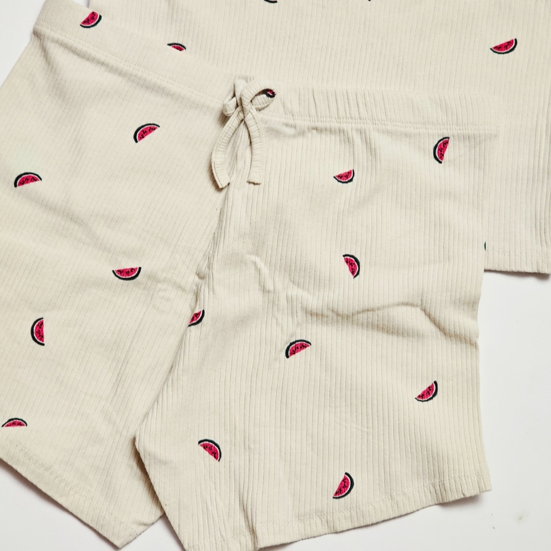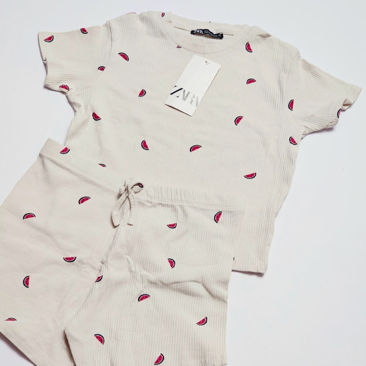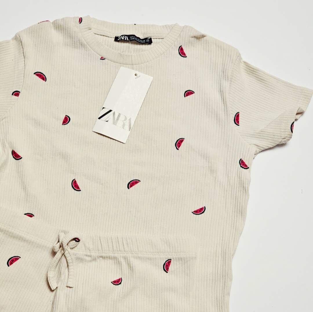 این ست خانگی دو تکه دخترانه از برند ZARA با طرحهای ریز هندوانه، انتخابی جذاب برای استایل تابستانی شماست. پارچهی نخی و لطیف، حس خنکی و راحتی را در خانه یا سفر به شما هدیه میدهد.
